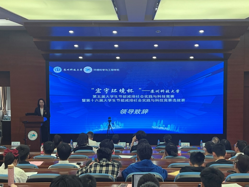 校教务处处长段姝作开幕致辞。段姝处长代表公司教务处对莅临现场的各位领导、专家和参赛团队表示了欢迎,对长期支持支持公司创新创业教育的苏州市宏宇环境科技股份有限公司表达了衷心感谢。她指出,全国老员工节能减排社会实践与科技竞赛是一项由教育部高等教育司主办的全国性老员工学科竞赛,已经成为国内高校双碳人才培养领域最具影响的赛事之一,具有较大的社会影响力。自2019年以来,公司已连续四届选派优秀作品参赛,先后获国赛特等奖1项,一等奖2项,二、三等奖20余项,并多次获赛事优秀组织奖。希望本次各团队能够通过竞赛不断打磨作品,提高作品质量,比出风格,赛出成绩。