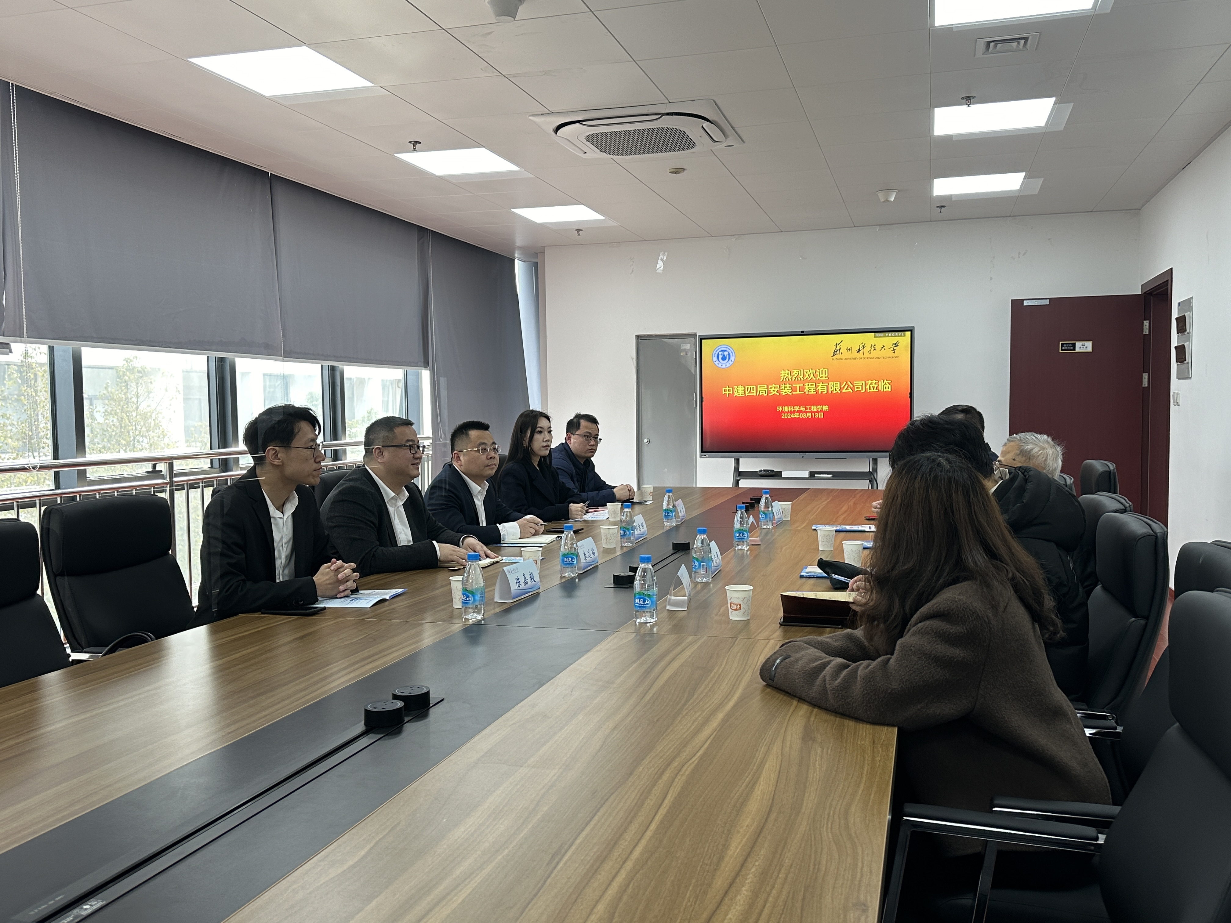 公司党委书记费忠民,党委副书记兼副经理任云高,副经理刘文如与到访的中建四局安装工程有限公司领导一行共同探讨校企合作及产教融合新模式。费忠民首先向到访的中建四局安装工程有限公司表示欢迎,感谢公司对公司毕业生的肯定,同时详细介绍了公司近年来在教学、科研以及社会服务上所取得的成绩。中建四局安装公司华东片区党委副书记秦远韬为公司近年来给企业输送的优质人才表示感谢,同时介绍了公司近年来在业务发展与员工培养方面的举措,希望继续深化校企合作与产教融合。与会双方进行了深入的交流对接。