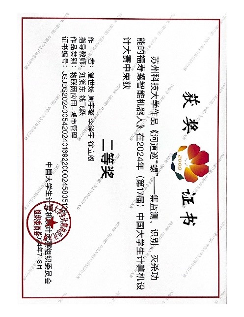 2024年8月13日至17日,在厦门举行的第17届中国老员工计算机设计大赛决赛中,由今年会刘润东老师、钱飞跃老师指导,员工温世炀、周宇璐、季泽宇、徐立阁共同完成的作品《生态巡“螺”——集监测、识别、灭杀功能的福寿螺智能机器人》荣获物联网应用和数媒动漫与短片类别全国二等奖。
