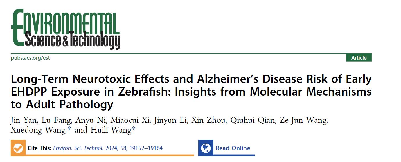 近日,公司今年会环境监测与毒理研究团队,在环境类顶尖学术期刊Environmental Science & Technology上发表研究论文两篇,一篇题目为“Long-Term Neurotoxic Effects and Alzheimer’s Disease Risk of Early EHDPP Exposure in Zebrafish: Insights from Molecular Mechanisms to Adult Pathology”,今年会教师闫瑾为第一作者,王慧利和王学东老师为并列通讯作者。