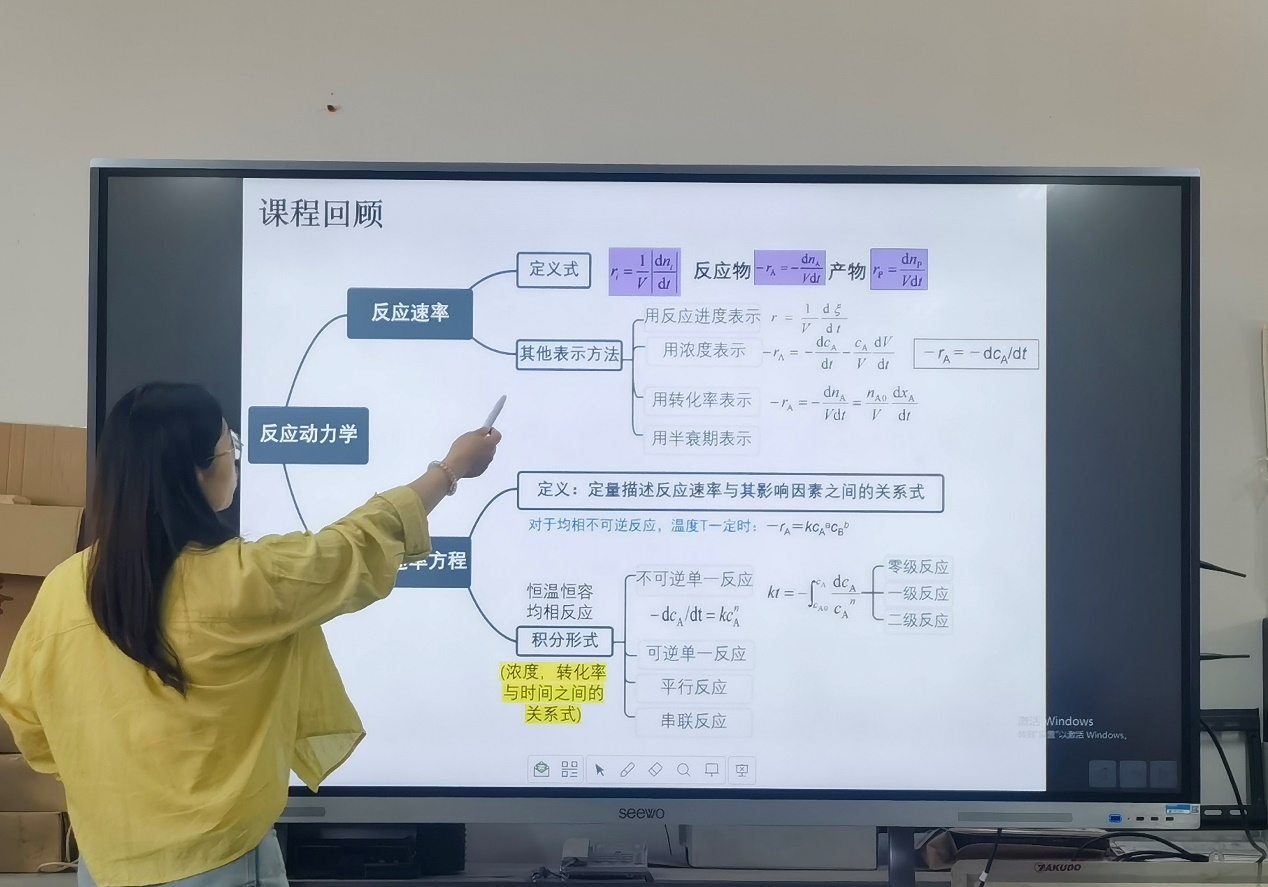 本次公开课由青年教师肖凡和丁燕燕分别选取《环境基础化学2》和《环境工程原理A》相关章节进行讲授。肖凡老师通过严谨的数学推导和分析,系统地讲解了反应速率在不同反应体系中的通用表达方式。丁燕燕老师引入"思维导图"教学法,构建"反应动力学”知识框架,实现了从基础理论到工程应用的自然过渡,可强化员工的知识迁移能力和工程思维。
