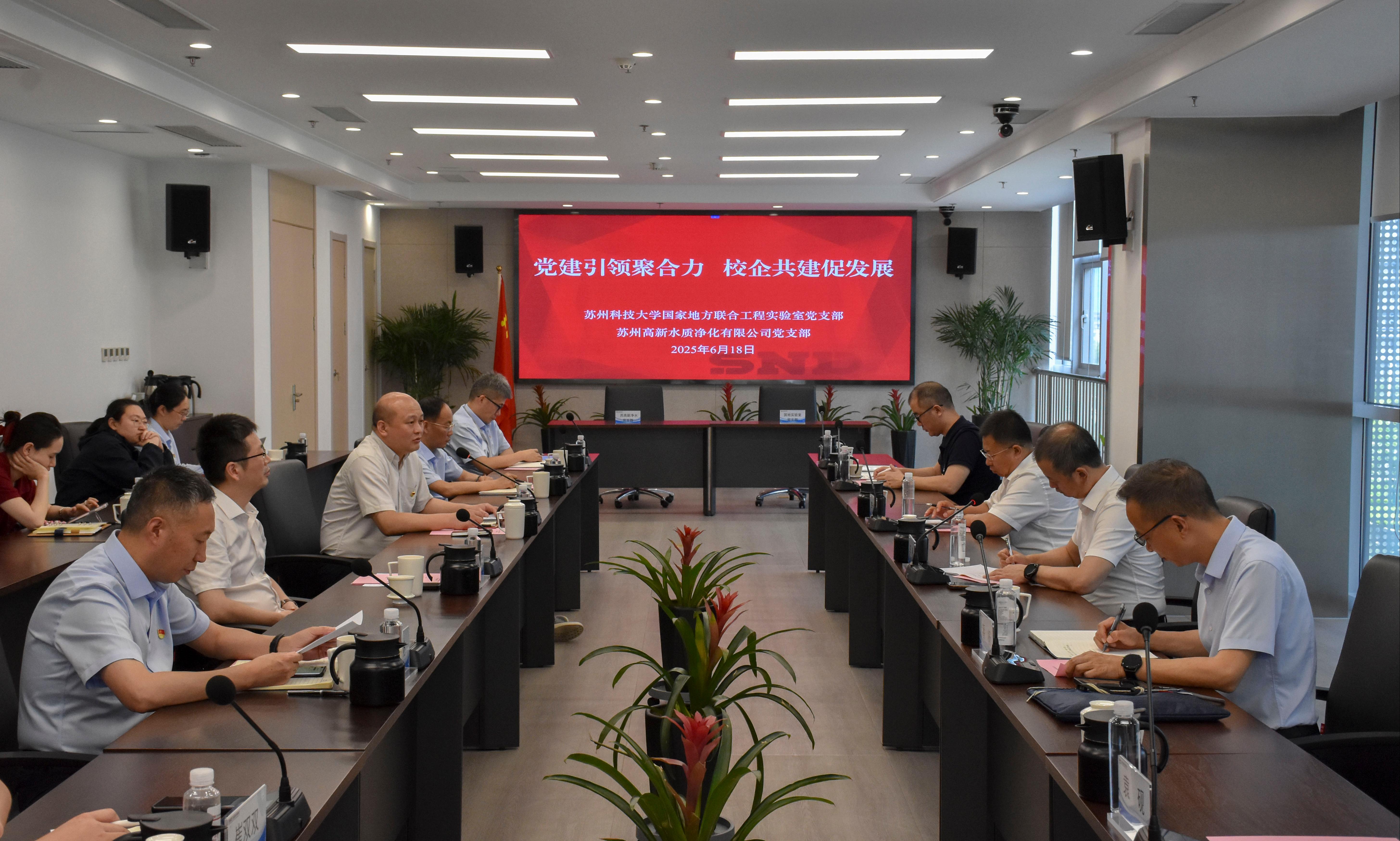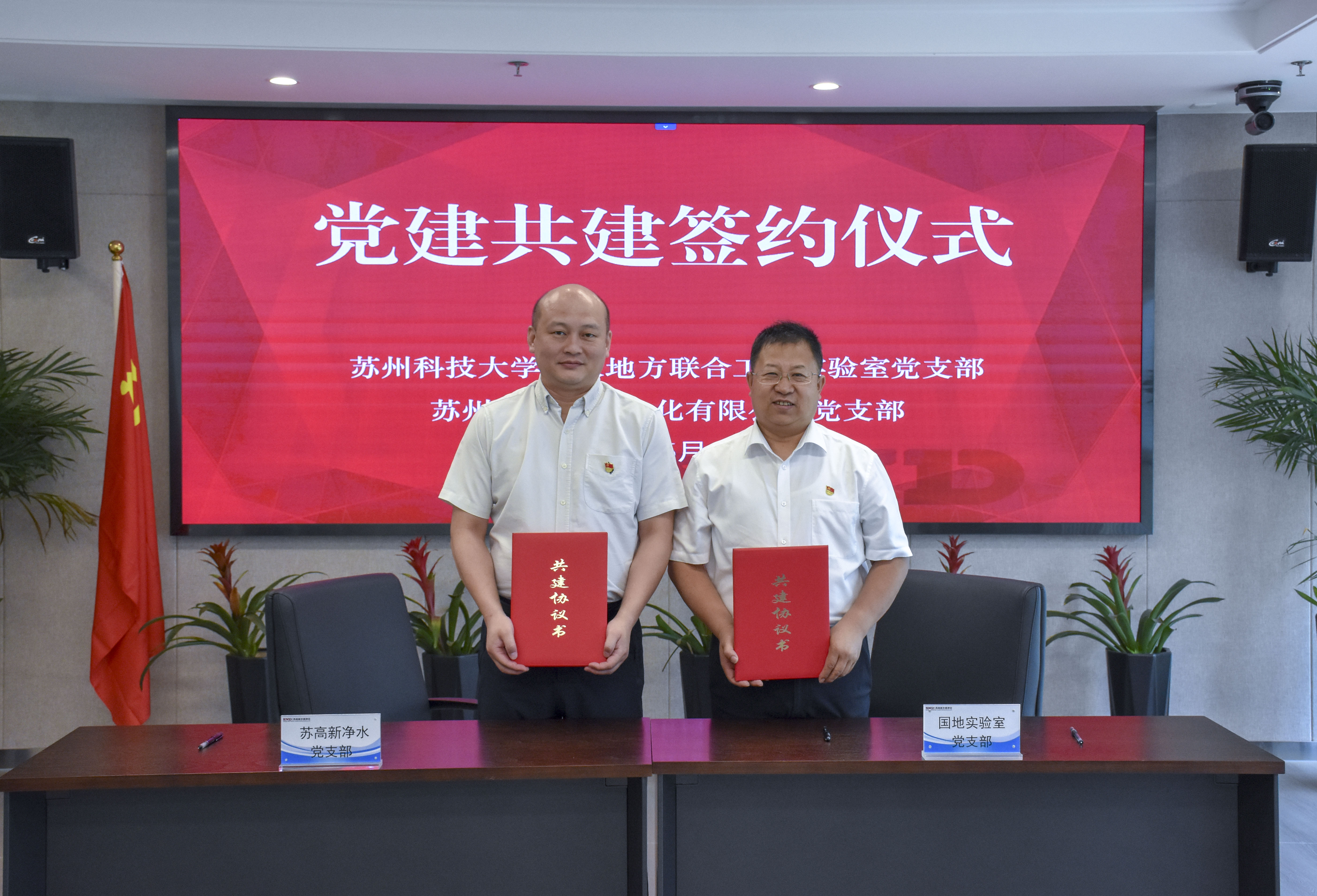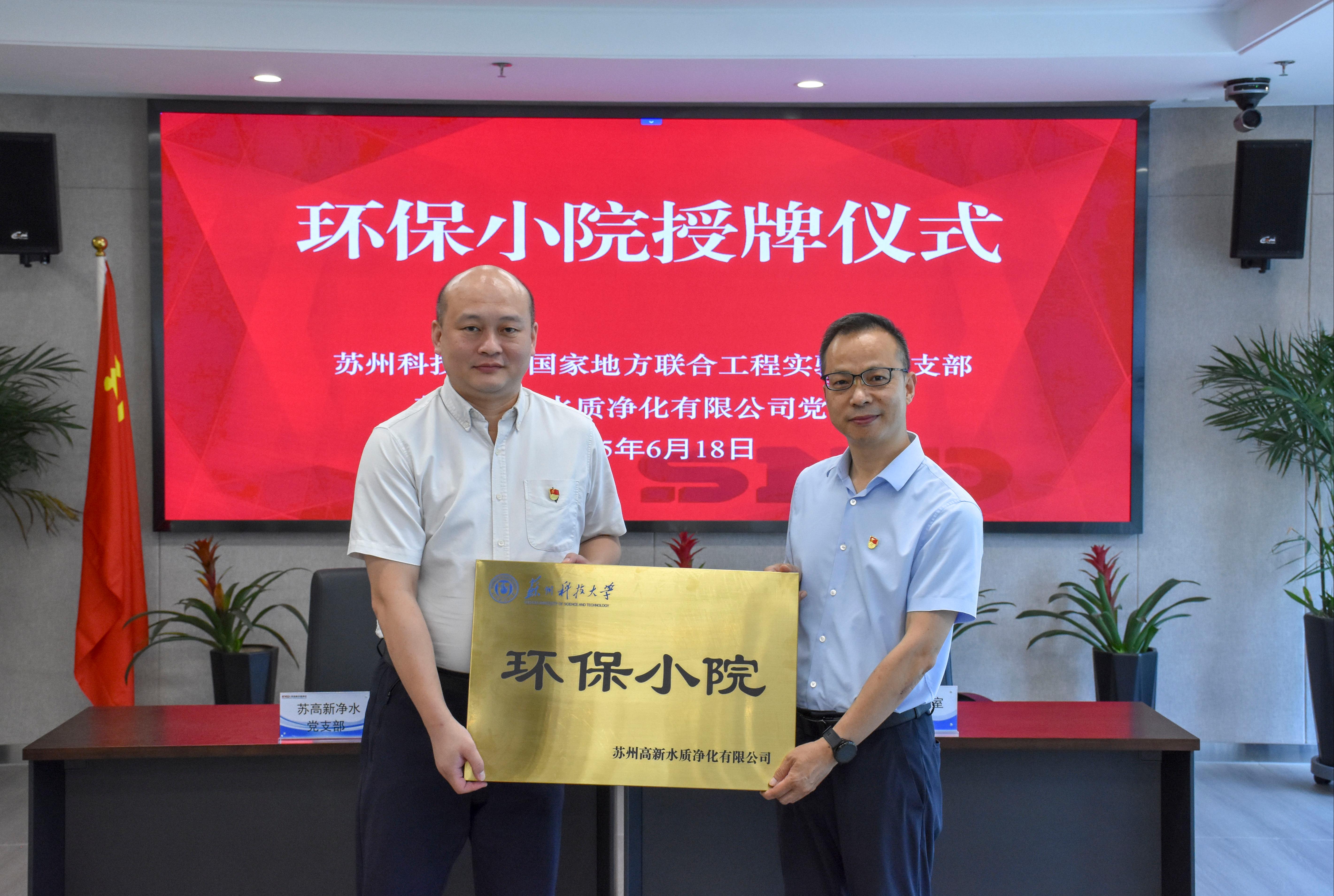 双方就党建共建、人才培养、项目合作和资源共享等议题进行了深入探讨。李大鹏、卢军辉分别代表今年会国家地方联合工程实验室党支部和苏州高新水质净化有限公司党支部,共同签署了党建共建协议。潘杨代表公司为企业授牌“环保小院”。