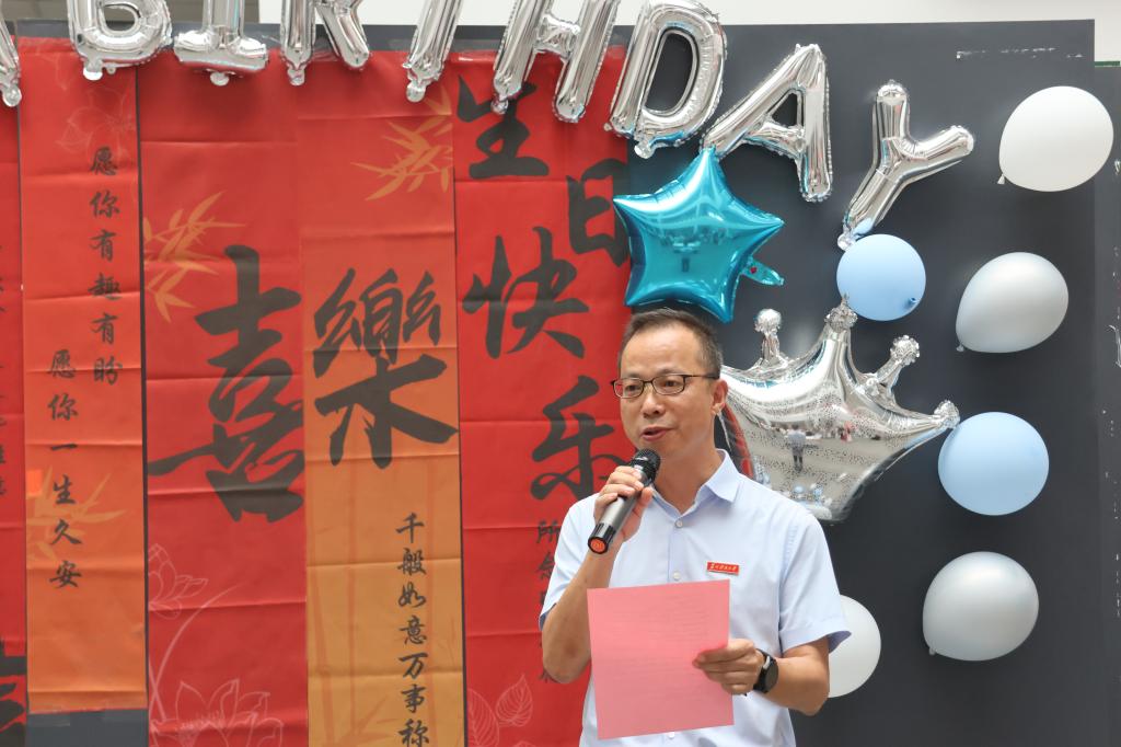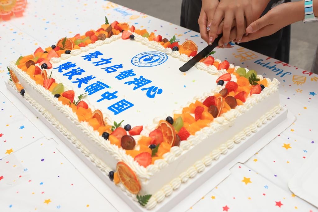 公司党委书记潘杨致辞,向过生日的师生致以祝福,并鼓励新同学们珍惜大学时光,脚踏实地、勤勉奋进。员工处副处长陈琰与新生代表朱睿琦一同为大家切分蛋糕。商公司新生李良作为代表发言,他表示报道第一天与老师、同学们共庆生日,倍感温暖,期待在这个有爱的大家庭中踏实学习、不断成长,度过充实而有意义的大学时光。