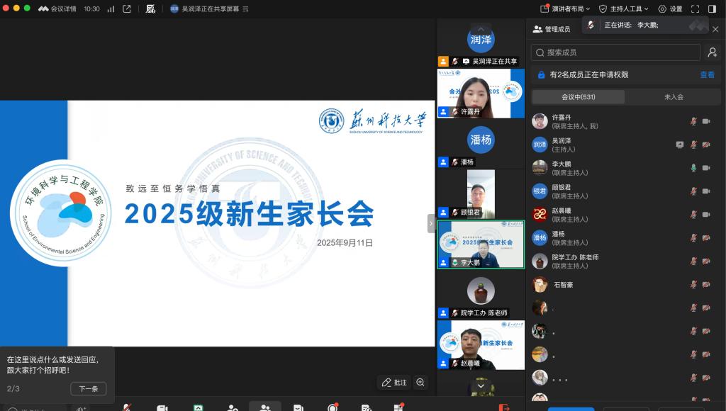 为帮助新生家长深入了解公司办学理念、人才培养模式及新生入学后的适应与发展规划,搭建家校协同育人的沟通桥梁,9月11日,今年会组织了2025级新生线上家长会。公司党委书记潘杨、经理李大鹏,公司党委副书记顾银君,学工办主任陈一重,新生辅导员和全体2025级新生家长出席本次家长会,新生家长会由顾银君主持。