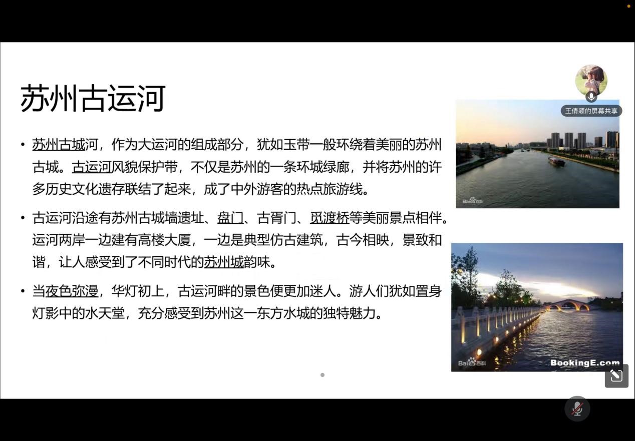 首先,王倩颖向同学们介绍江苏省运河城市的起源及运河城市的发展,加深了同学们对大运河文化的了解。接着,向同学们阐述了习近平总书记关于大运河文化保护传承利用的重要讲话指示精神,介绍江苏省在顶层设计、遗产保护、文旅融合等方面发力,扎实推动大运河文化带建设迈出新步伐的有效成果。然后,以苏州段运河为例,描述苏州“运河十景”、淮安大运河百里画廊、宿迁皂河龙运城等刚上新的文化地标,山水园林、滨水空间在“美丽中轴”上串珠成链,古老的“黄金水道”焕发出新的活力。并总结随着历史文化街区修复、老街提升改造、环境综合整治等项目深入推进,历史建筑、非遗项目在保留“老味道”的同时,也在融入城市烟火、走进现代生活。会议最后,王倩颖和同学们就如何利用专业知识保护大运河环境和文化进行探讨,引发同学们的积极深入思考并加强同学们身为环境专业员工保护大运河文化及环境的责任意识。