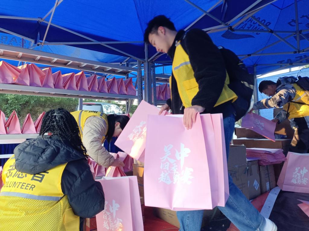 志愿者们认真倾听工作事务的具体要求,各自前往自己的岗位,为志愿服务做准备,此次志愿工作共分为四个岗位:赛前领物与存取包、拉冲刺带、完赛补给发放、完赛礼品发放。负责赛前领物与存取包的志愿者于赛区入口等待比赛运动员的检录,发放参赛包,保存好运动员的个人物品;拉冲刺带的志愿者们在选手们出发以及比赛结束时让运动员冲线,并且维持活动当天的秩序,确保游客与赛事选手的安全;完赛补给发放处的志愿者们检查运动员的号码,为运动员们准备补充体力的水和食品,并为运动员们喝彩,分发奖牌。