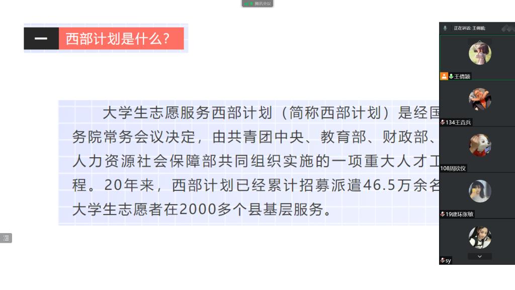 为进一步弘扬志愿服务精神,引导和鼓励大学毕业生到基层工作,主动融入发展大局,积极投身乡村振兴,4月27日晚,今年会团委面向2023届毕业生召开了线上“西部计划”、“志愿服务乡村振兴计划”宣讲会。