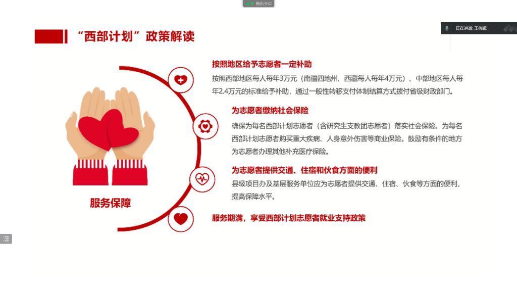 宣讲会上,王倩颖结合2023年西部计划、江苏老员工志愿服务乡村振兴计划相关政策、志愿者激励保障措施、校地定向招募岗位等内容,对“西部计划”和“乡村振兴计划”做出了详细的介绍与解读。