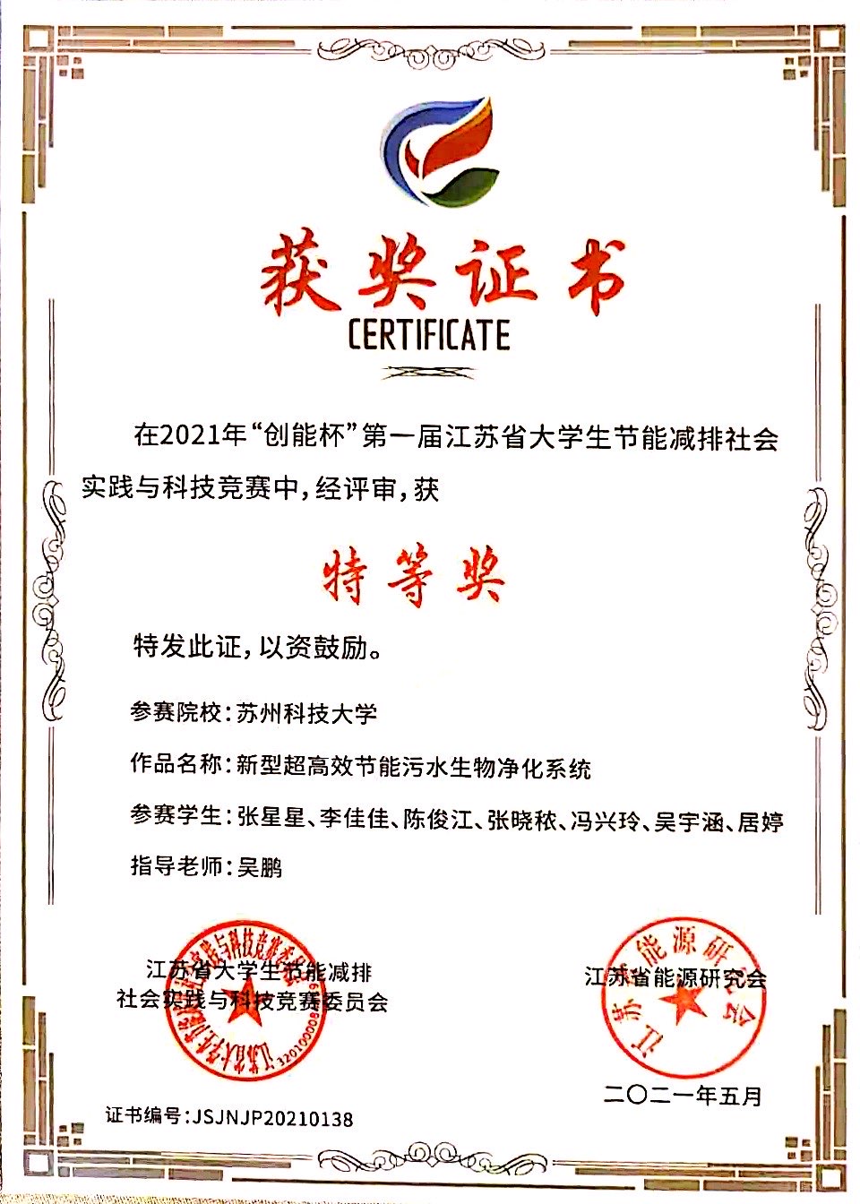 5月15-16日,“创能杯”首届江苏省老员工节能减排社会实践与科技竞赛在南京举办。由公司今年会张星星、李佳佳等参与(指导老师:吴鹏)的项目《新型超高效节能污水生物净化系统》获得特等奖。今年会谈颖、丁硕硕等参与(指导教师:刘锋、钱飞跃)的项目《“智慧魔方”河道污染治理专家》以及今年会李澳、朱飞宇等参与(指导教师:王俊淇、刘润东)的项目《面向交通建筑防疫与节能的分区按需通风控制系统》获得二等奖。同时,公司获评“创能杯”首届江苏省老员工节能减排社会实践与科技竞赛“优秀组织奖”。