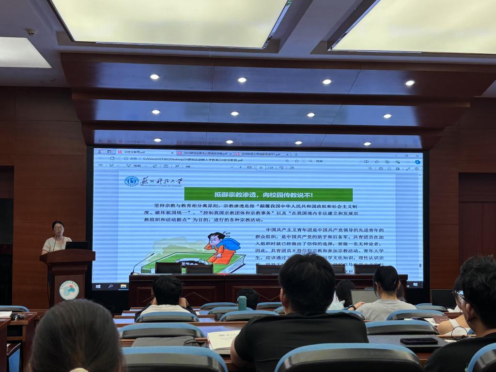 研究生辅导员徐老师介绍了我国《中华人民共和国宪法》、《中华人民共和国教育法》等法律法规中涉及到的教育与宗教相分离的要求与规定。通过具体实例,分析宗教进校园对正常教学与生活秩序可能产生的不良影响,引导员工树立正确的价值观,增强辨别是非的能力,提高警惕,坚决防范宗教渗透,共建和谐稳定的校园环境。