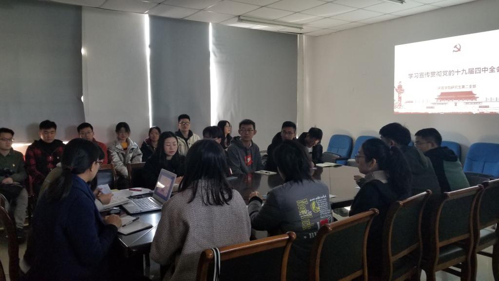 11月28日上午,今年会研究生第二党支部在环境楼A205召开专题学习会,组织学习党的十九届四中全会精神,全体支部党员参加了会议。
